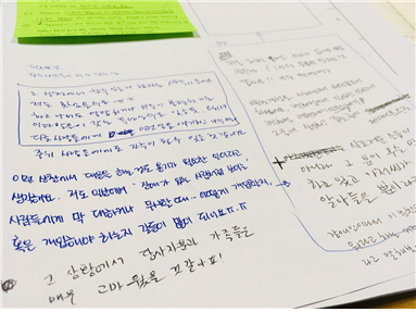 각자의 경험과 감정을 나누고 난 후에는 또 다시 새로운 질문이 기다리고 있습니다. 다시 그 상황으로 돌아가게 된다면 나는? 내가 하고 싶은 바대로 행동하기 위해서 나에게 필요한 외부의 자원이나 다른 사람들이 해줄 수 있는 것은 무엇일까? 각자의 경험을 작성한 종이를 돌려가며 모두에게 자신의 꿀팁과 지지의 한마디를 남겨주는 것도 잊지 않고요. 저 같은 경우에는 ‘다시 그 상황으로 돌아가게 된다면?’이라는 질문에 “다시 뭐라고 이야기할 수 있을지가 잘 떠오르지 않네요(눈물)”이라고 적었는데, 도무지 생각이 나지 않더라구요. 그럴 때 비슷한 경험을 하신 분이 자기가 대응했던 방법을 새롭게 알려주시기도 하고, “그런데 충분히 잘하신 것 같아요! 박수 짝짝짝”이라고 써주신 것을 보며 며칠 동안 혼자서 씩씩거렸던 마음이 차분해지는 느낌이었습니다. 제가 다른 분들에게 써준 이야기들이 함께 분노하거나 마음을 도닥여주는 말이 되기를 바라는 마음도 함께요.