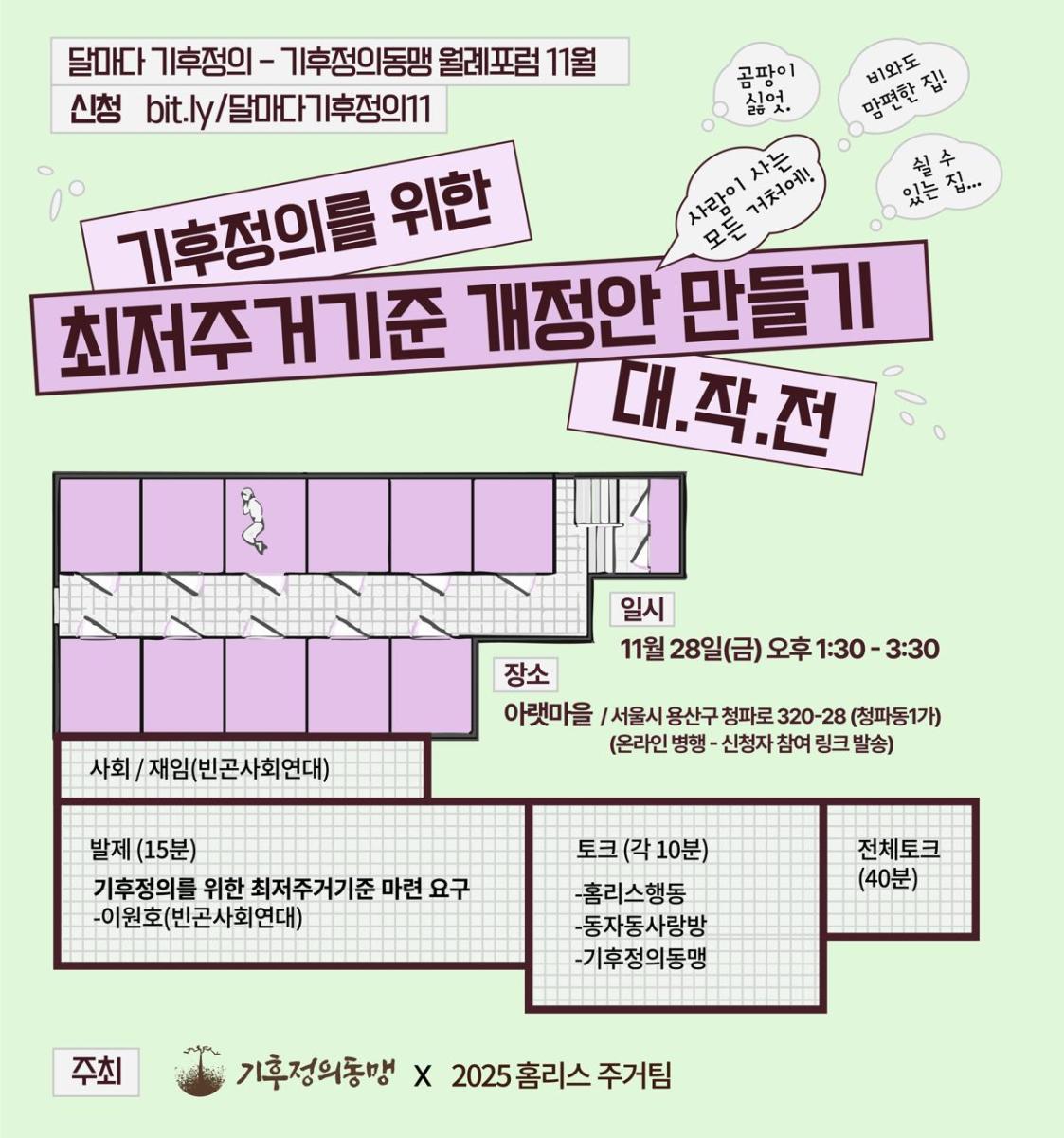 11월 28일 금요일 아랫마을에서 기후정의동맹의 세 번째 월례포럼으로 <기후정의를 위한 최저주거기준 개정안 만들기 대.작.전> 워크숍이 진행됐다. 폭염, 폭우, 한파가 일상이 된 기후위기 시대에 집의 조건이 생존과 존엄을 위한 중요한 권리임이 보다 명확해지고 있다. 그러나 한국의 주거기본법 상 ‘최저주거기준’은 여전히 면적 중심의 논의에만 머물러있고, 난방과 단열 등의 구체적 해결책은 제시하고 있지 못한다. 또 최저주거기준이라는 개념 자체가 ‘주택법’에 따른 ‘주택’만을 대상으로 하는 바람에 쪽방과 고시원, 이주노동자들이 많이 사는 비닐하우스 등의 다양한 형태의 거처는 안전의 사각지대에 방치되어있다. 월례포럼은 소수 전문가나 관료들의 시선이 아닌 비적정 주거에서 살아온 이들의 경험과 필요 위에서, 특히 기후정의의 관점에서 새로운 주거 기준을 써보자는 취지로 준비되었다.