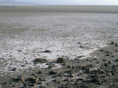 ▲ 물막이 공사한 지 얼마 지나지 않은 지난 4월 21일의 새만금 살금 갯벌. 염분이 하얗게 드러나 안타까움을 자아낸다. <사진 출처: 새만금사업을반대하는사람들>
