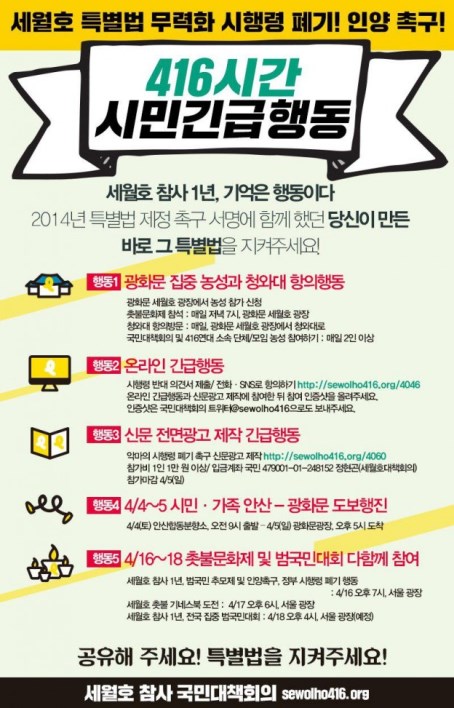 세월호 참사 이후에 시민들은 세월호에 죽게 내버려진 사람들을 떠올릴 때마다 국가를 곱씹기 시작하였다. 세월호 참사는 유족들만의 불운이 아니라 누구에게나 있을법한 사태임을 즉각 인식하게 되었다. 그래서 시민들은 감성적으로든 이성적으로든 국가로부터 버림받은 인간의 비참한 운명과 연대를 이룸으로써 악몽 같은 삶의 허망함을 퇴치하려고 안간힘을 다했다. 사람이 죽어가는 장면 앞에서 수수방관에 대한 죄책감과 피해자로서의 분노가 지난 1년을 버티게 해온 자양분이었다. 바로 며칠 전 세월호 침몰과정에서 적극적으로 구조활동에 나섰던 한 분이 자해를 시도했다는 기사를 통해 참사가 남긴 깊은 상처를 가늠해본다.
