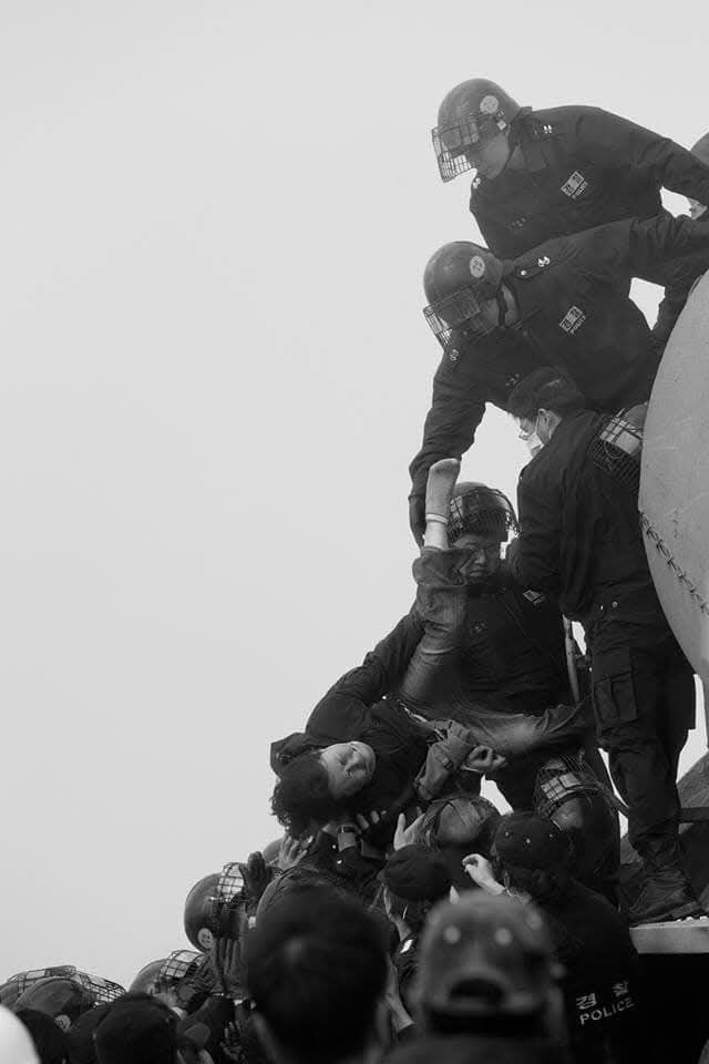 2006년 어느 날 대추리. 미군기지 확장 저지 투쟁 중 레미콘에서 끌려 내려오던 나. 노순택 작가가 찍었다. 그가 '올해의 작가'로 선정되었던 해 국립현대미술관에서 이 사진을 만났다.